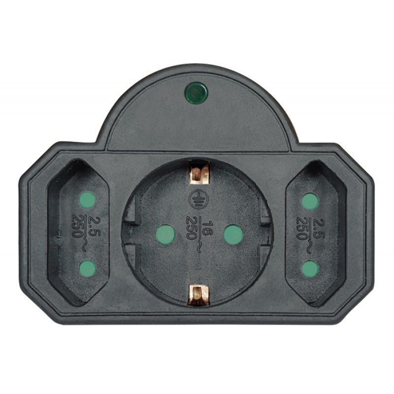 Αντάπτορας ρεύματος Powertech 3 θέσεων, 1x schuko και 2 διπολικών, με μηχανισμό ασφαλείας για παιδιά και προστασία υπέρτασης.